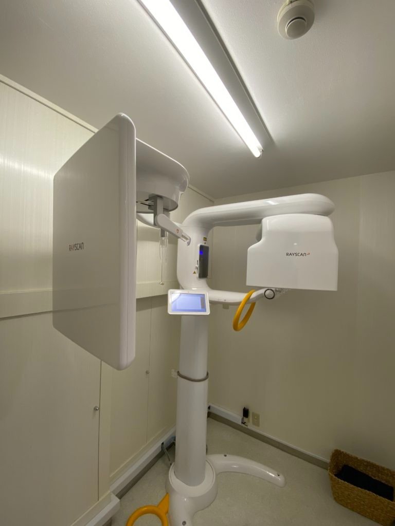この写真の右側の機械を使用して撮影します。この機械は「精密検査における横顔のレントゲン写真について」でも登場したRAYSCANを使用します。RAYSCANは低線量で、かつ短時間での撮影を可能にしたモデルとなります。