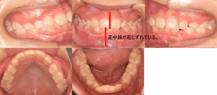 歯が生えている向きによって噛み合わせがずれたり交差したりすると、その部分が原因となって正中不一致が起きている。
