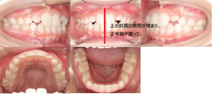 | 治療内容 | マウスピース型カスタムメイド矯正歯科装置(製品名インビザライン・ファースト 完成物薬機法対象外)を使用して主訴である前歯の隙間を閉じると同時に永久歯の生える場所を確保。 前歯のかみ合わせが深い過蓋咬合についても前歯の重なりがなくなるように改善した。 |
